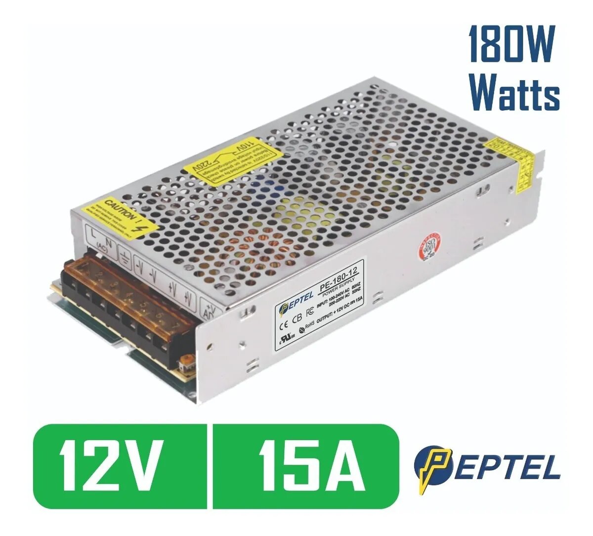 La Fuente de poder switching 220V AC / 12V DC 15A 180W se encuentra contenida en un gabinete metálico tipo rack, construido en aluminio.