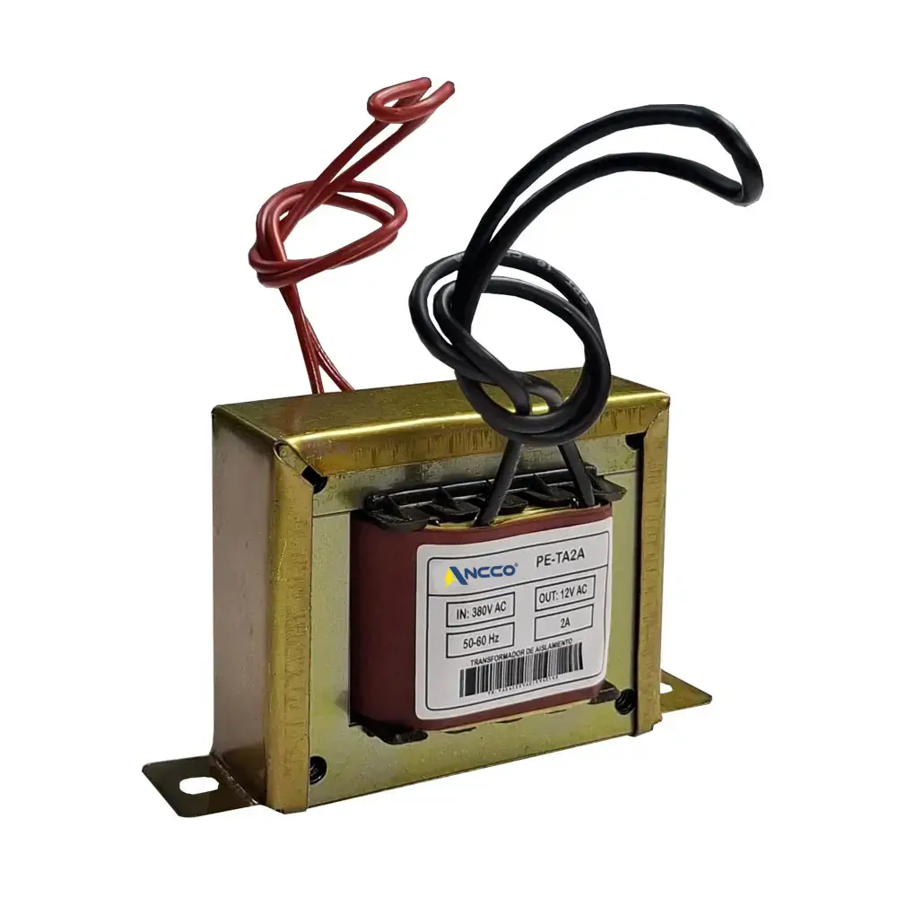 Un transformador monofásico de 380V a 12V 2A es un dispositivo reductor de voltaje de corriente alterna (AC) que toma una entrada de 380V AC y la convierte a una salida de 12V AC, capaz de suministrar una corriente máxima de 2 Amperios, resultando en una potencia de 24W.